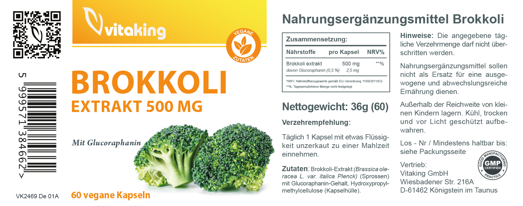 Unser hochwertiger Brokkoli-Extrakt enthält 500 mg Brokkoli-Extrakt pro Kapsel, davon 2,5 mg Glucoraphanin – die natürliche Vorstufe des wertvollen Sulforaphans.