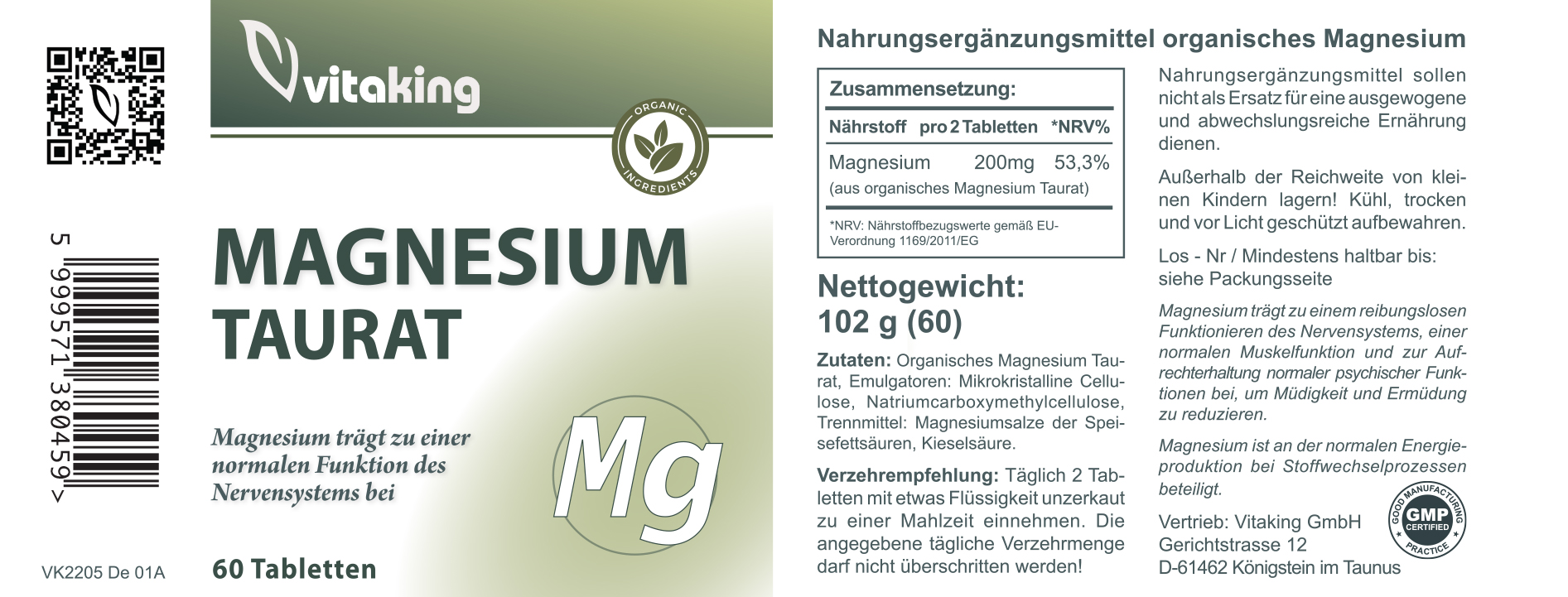 Vitaking Organisches Magnesiumtaurat ist eine hochwertige Wahl für alle, die auf eine effektive und gut verträgliche Magnesiumversorgung Wert legen. Magnesiumtaurat ist eine organisch gebundene Form von Magnesium, bei der das Mineral mit der Aminosäure Taurin kombiniert ist und sich durch eine gute Bioverfügbarkeit auszeichnet.