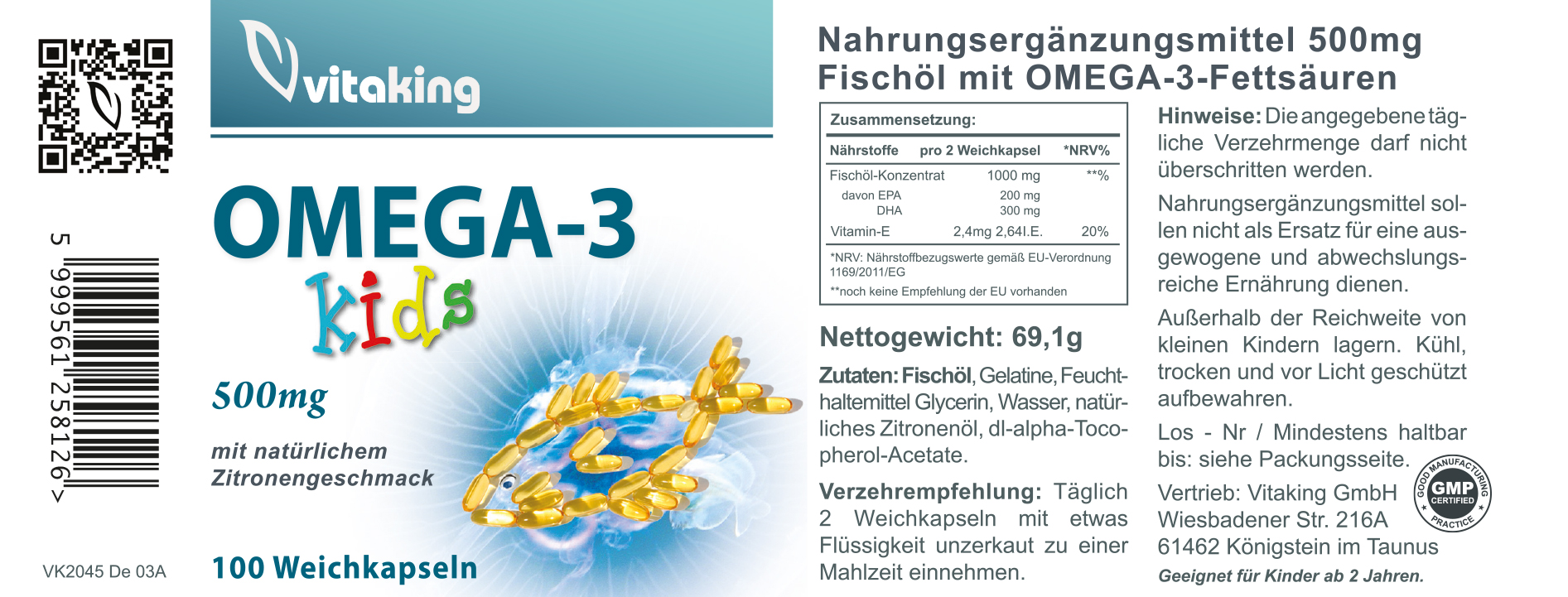 Vitaking Omega-3 Kids ist ein Nahrungsergänzungsmittel mit hochwertigem Fischöl, das speziell für Kinder ab 2 Jahren entwickelt wurde. Es liefert die wertvollen Omega-3-Fettsäuren DHA (Docosahexaensäure) und EPA (Eicosapentaensäure) in einer kindgerechten Dosierung – in leckerem Erdbeergeschmack, ohne Fischgeruch.