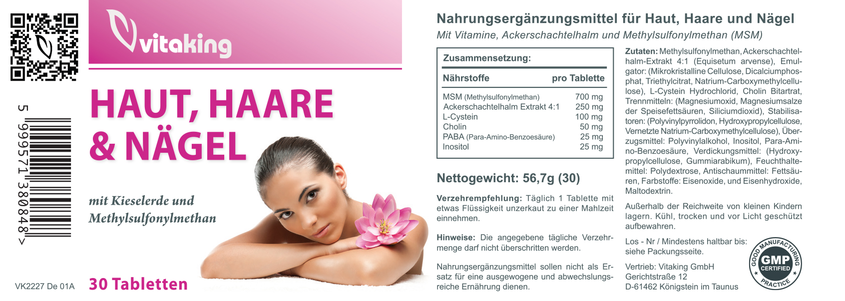 - MSM (Methylsulfonylmethan) – Eine organische Schwefelverbindung, die für die Bildung von Aminosäuren und die Struktur von Haut, Haaren und Nägeln wichtig ist.