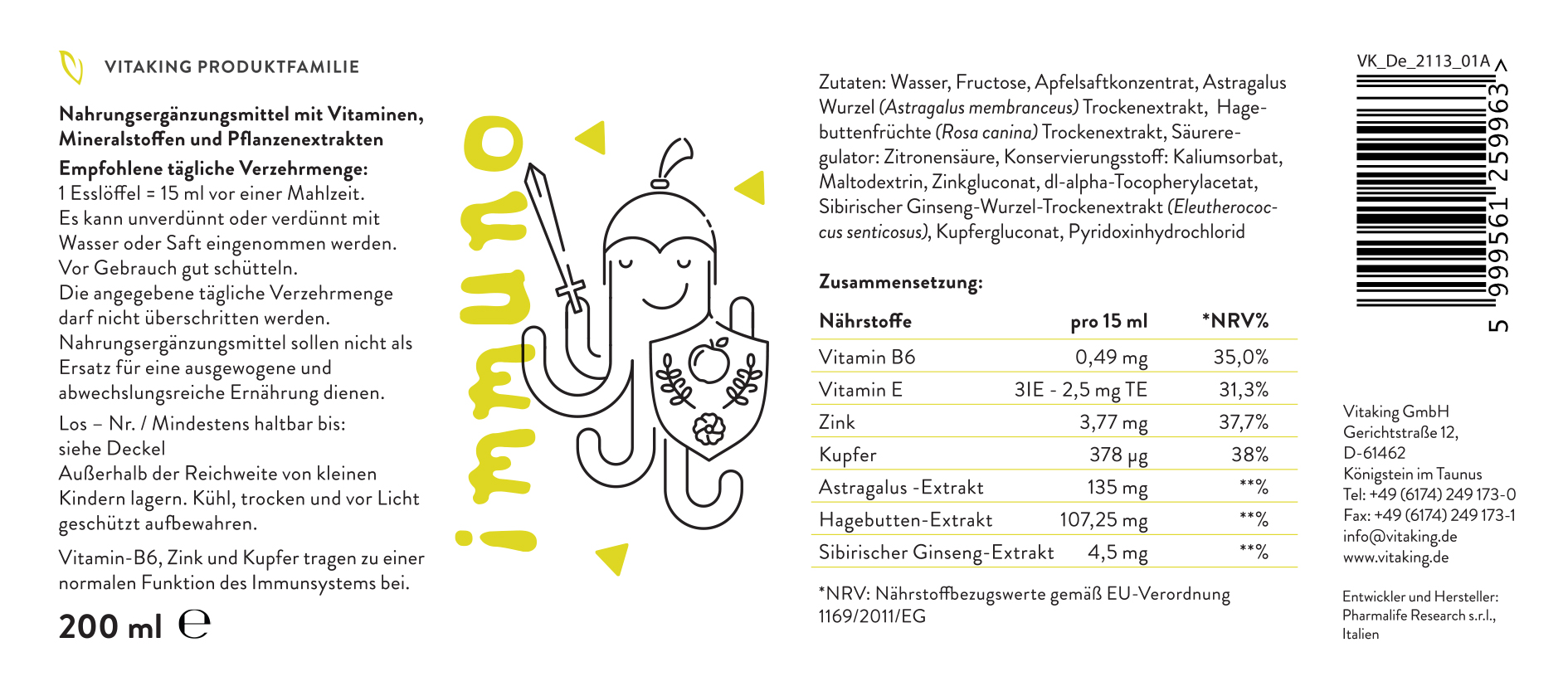 Vitaking Immuno Sirup ist eine ausdrücklich für Kinder entwickelte, spezielle Mischung aus Vitaminen, Mineralstoffen und Heilpflanzen, in der die einzelnen Komponenten zur normalen Funktion des Immunsystems beitragen. Kinder nehmen nur ungern Tabletten oder schlecht schmeckende Sirups ein, aber mit dieser Mischung können wir ihnen sogar eine Freude bereiten. Dank seines leckeren Geschmacks wird es schnell beliebt und kann in die tägliche Ernährung von Kindern integriert werden.